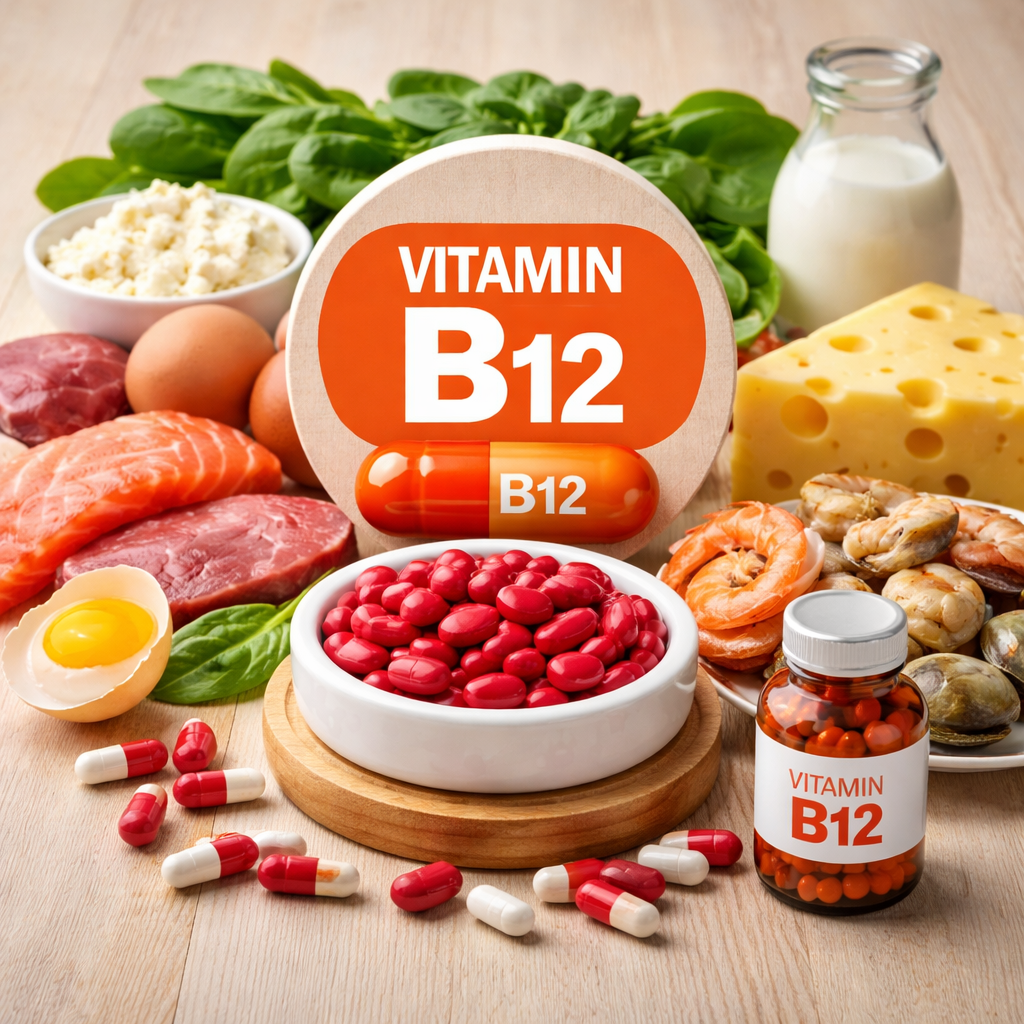विटामिन B12 एक पानी में घुलनशील विटामिन है, जो मुख्यतः पशु-आधारित खाद्य पदार्थों में मिलता है, जैसे दूध, दही, पनीर, अंडा, मांस और मछली। शाकाहारियों में इसकी कमी होने की संभावना ज्यादा होती है क्योंकि इसमें यह विटामिन बहुत कम मात्रा में मिलता है।